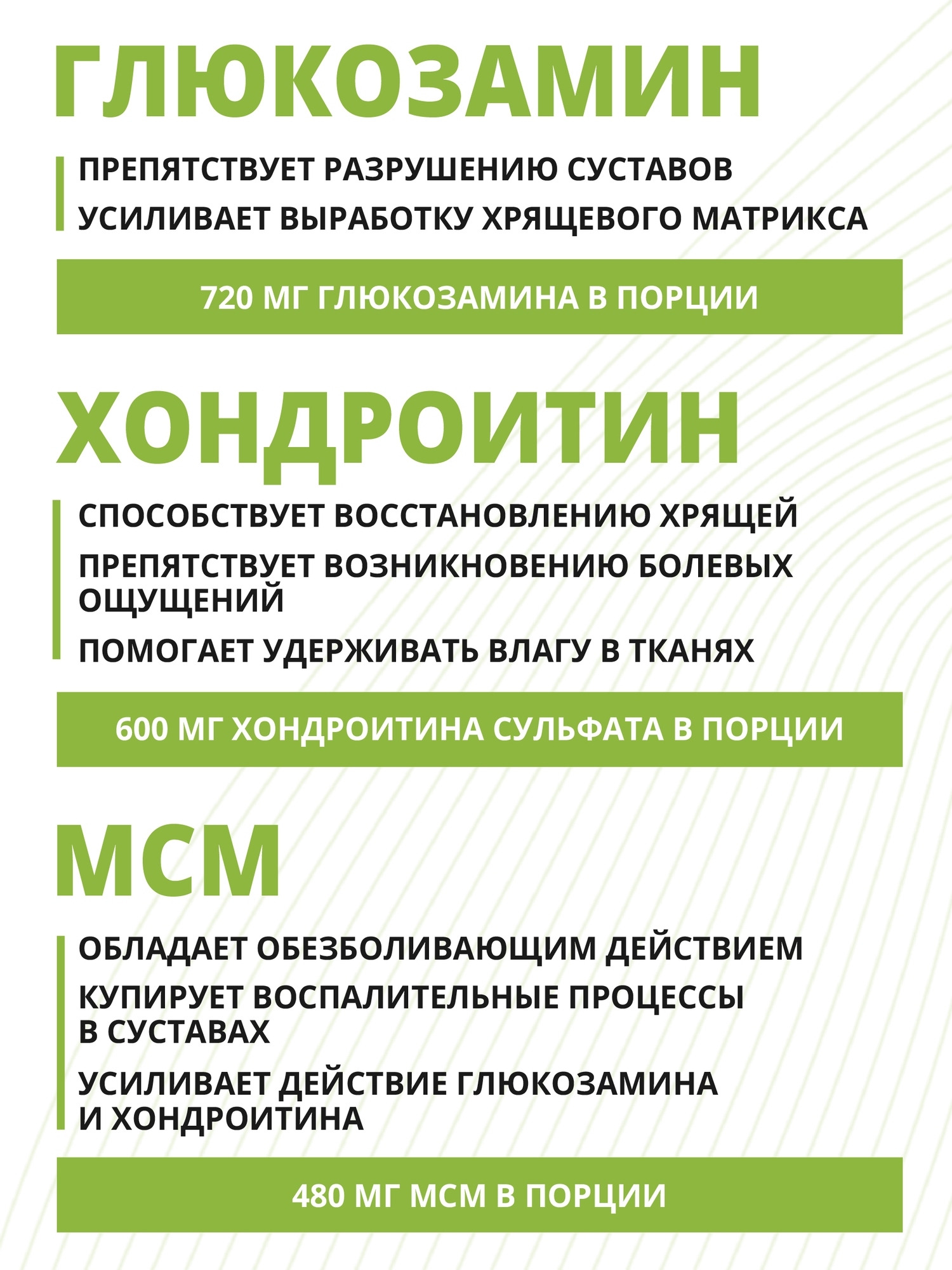 Формула включает три ключевых компонента. Глюкозамин является важным элементом для синтеза и регенерации хрящевой ткани и суставной жидкости. Хондроитин способствует сохранению влаги в хряще, поддерживая его эластичность и амортизирующие свойства.
